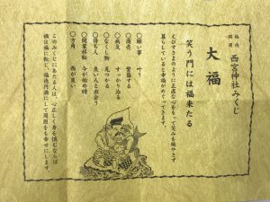 また、当事務所開設後、毎年の恒例行事として、西宮神社に初詣し、祈祷を受けた後におみくじを引いているのですが、今年は「大福」というおみくじが当たりました。「大福」のおみくじは、平成最後の年にえびす様の大きな福を受けてもらおうと考案され、用意されたおみくじの筒に1本ずつ入っているそうで、大吉よりさらに縁起の良いものという位置づけとされているそうです。